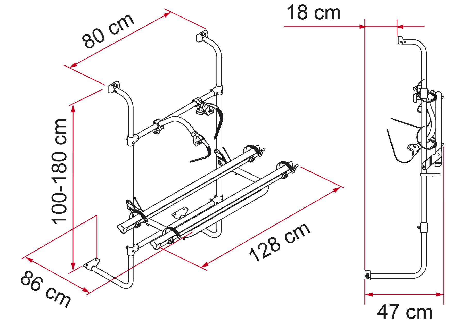 Variabel afstand mellem øverste og nederst monteringspunkt: 100 til 180 cm.